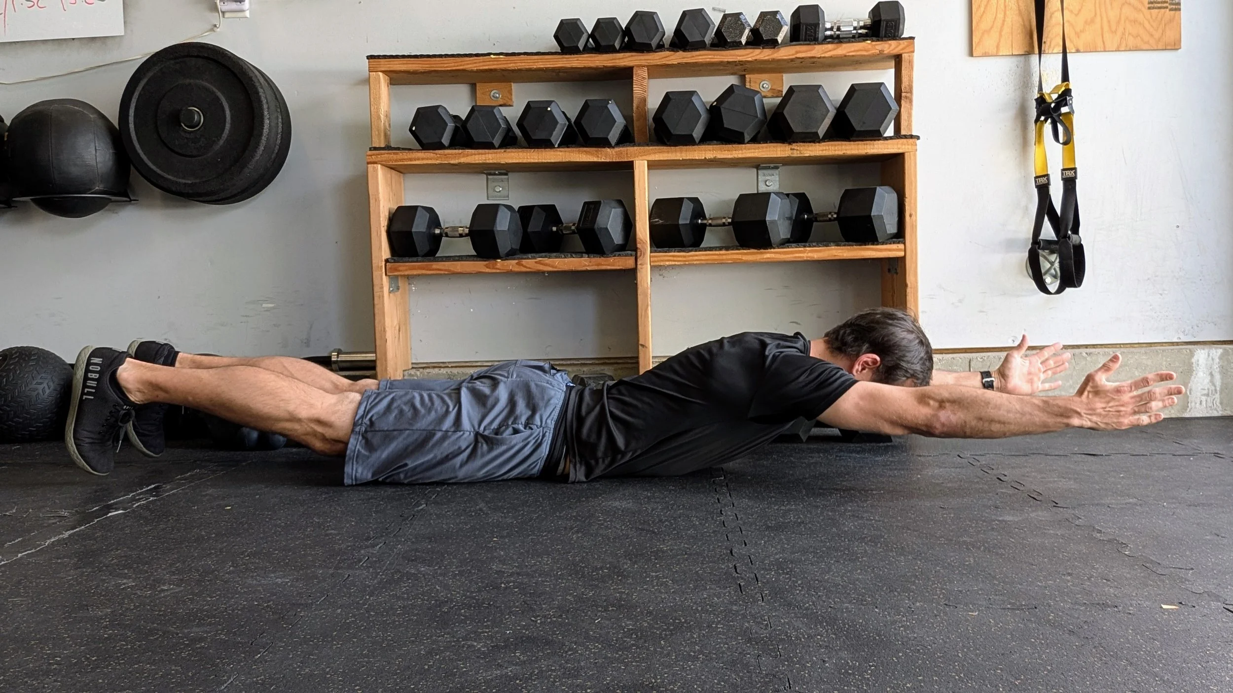Lie face down on the floor with arms extended straight overhead, palms facing in and legs straight (both knees & hips fully extended). Lift your arms, chest, and legs a few inches off the ground at the same time, keeping everything tight and aligned.